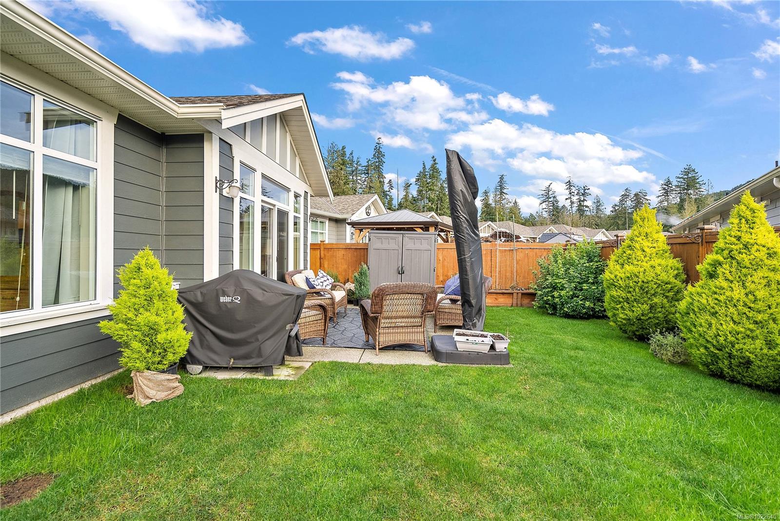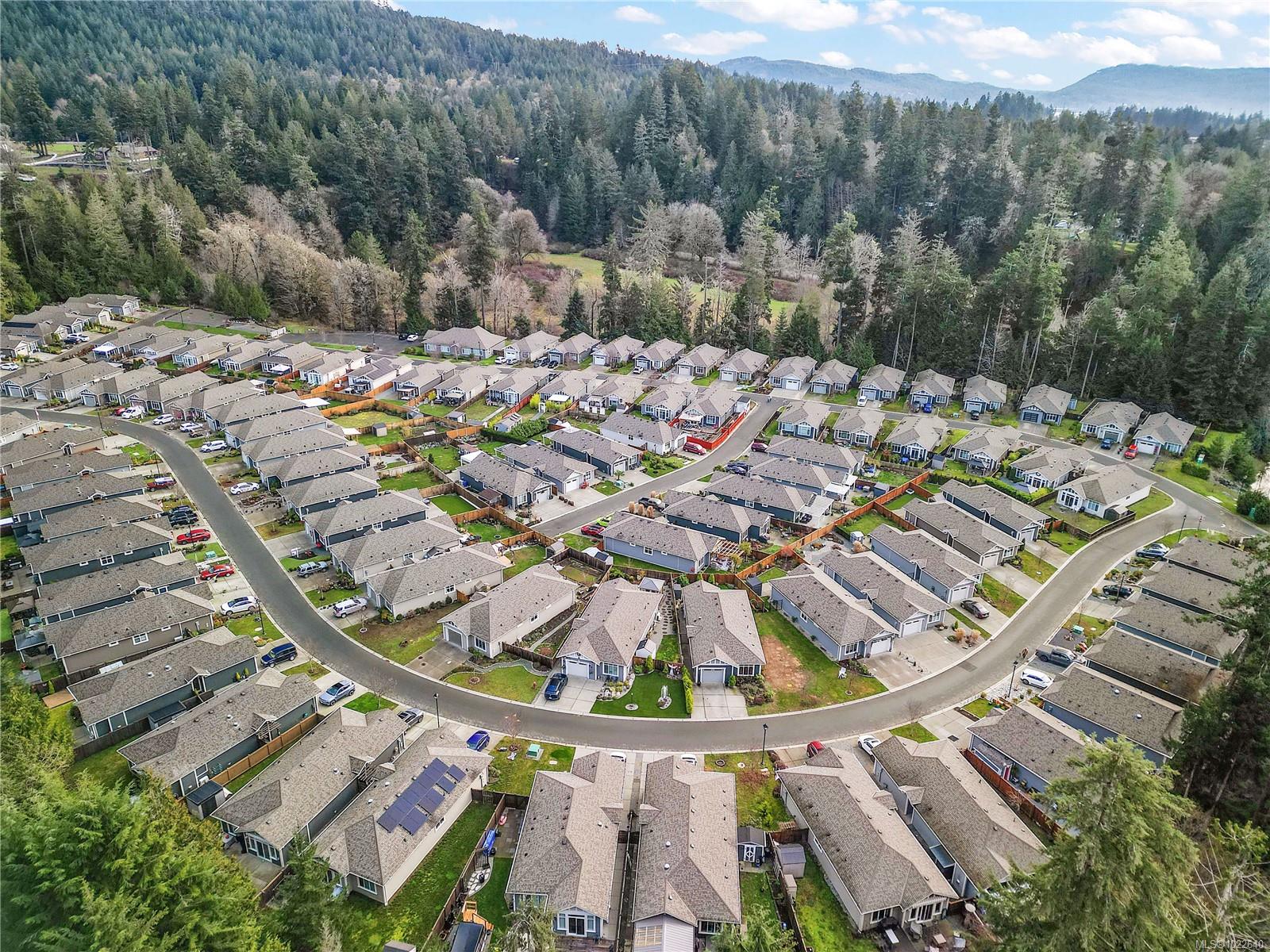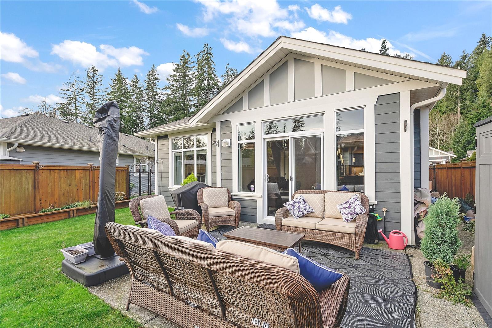 Welcome to RiversEdge Village at Sunriver Estates, surrounded by parkland, scenic trails, and the Sooke River. 2427 Fern Way features The Magnolia, the largest floor plan in the community, offering 1,188 sq. ft. of thoughtfully designed living space on a 4,868 sq. ft. lot. This patio-style home includes a spacious one-car garage with 220V and EV charger, three generous bedrooms, and two bathrooms. The open-concept living and dining area is ideal for comfortable living and entertaining, highlighted by a natural gas fireplace. The well-appointed kitchen features quartz countertops, stainless steel appliances, and abundant workspace, while a light tube enhances natural brightness throughout the home. Additional features include a ductless heat pump in the living room, front and primary bedroom, air conditioning, tankless hot water, front and back yard irrigation, and a hot tub rough-in on the back patio. Enjoy an active and social lifestyle with access to the community Club House—perfect for hosting gatherings, watching the big game, playing pool, or enjoying summer BBQs and horseshoes on the patio. Club house has two rentable bedrooms. Rivers Edge community includes RV and boat storage. Seaparc Leisure Center is just a short walk away, offering swimming, fitness classes, ice skating, and more. A wonderful opportunity to enjoy comfortable, low-maintenance living in a vibrant and welcoming community.